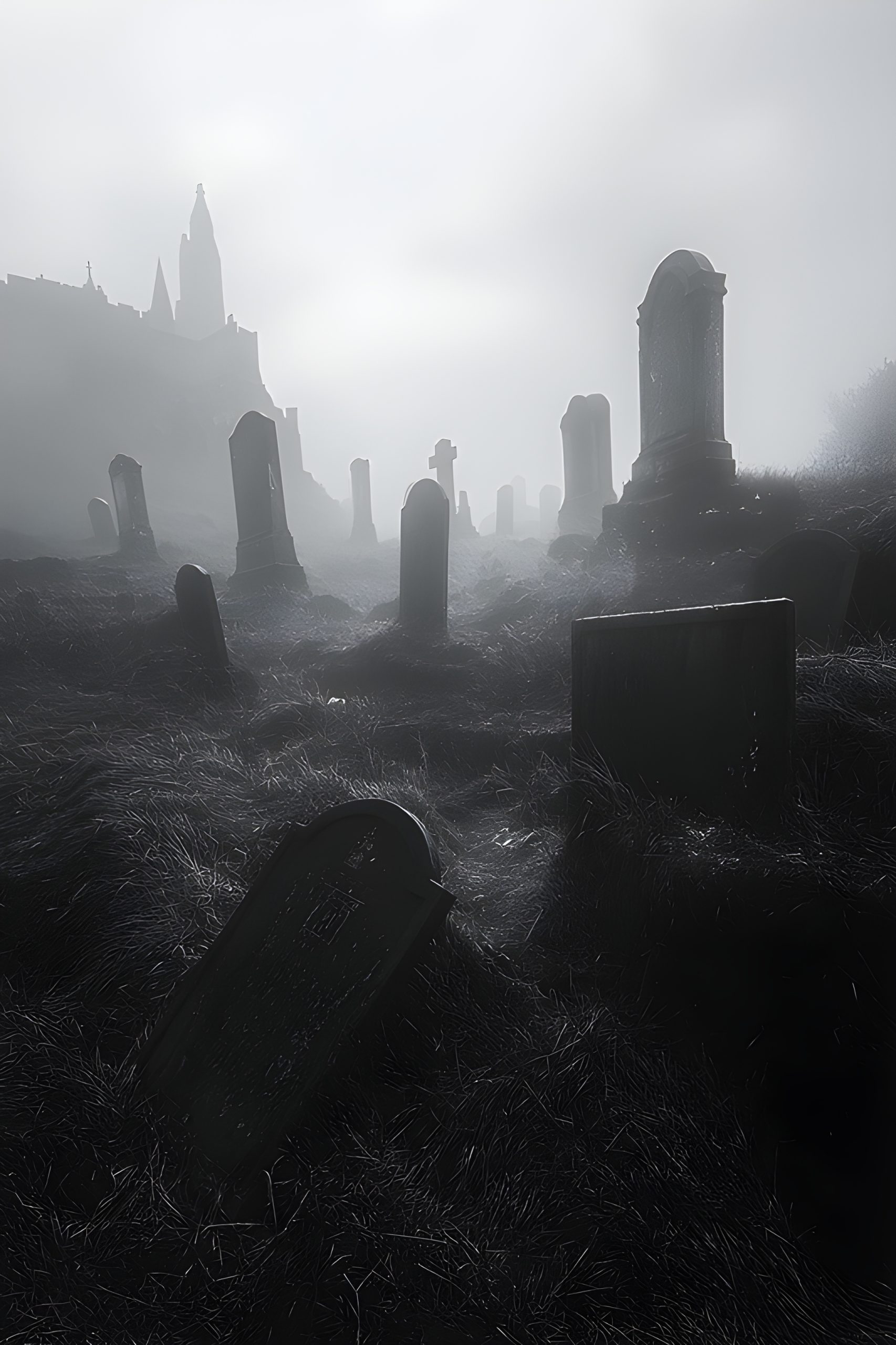 Misty Graveyard, Castle View - Impossible Images - Unique stock images of Misty.wet Graveyard Secrets: Unearthed Relics Rewrite History. .